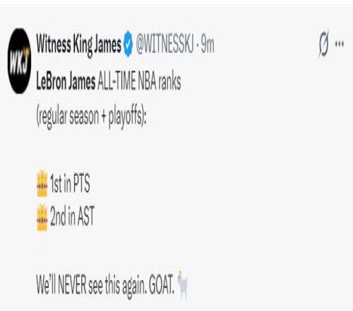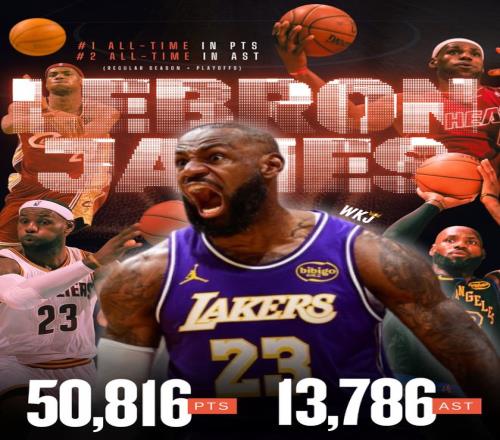 湖媒WKJ:詹姆斯在NBA历史(常规赛+季后赛),总得分历史第一,总助攻历史第二,我们以后再也看不到这样的球员了,GOAT。