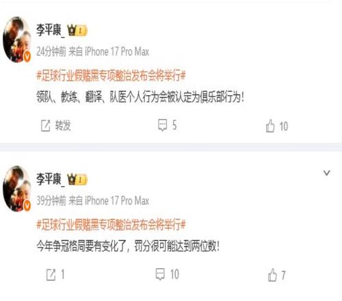 周四10时,足球行业“假赌黑”专项整治行动相关会议在北京召开。媒体人李平康透露,“争冠格局要有变化了,罚分很可能达到两位数”。
